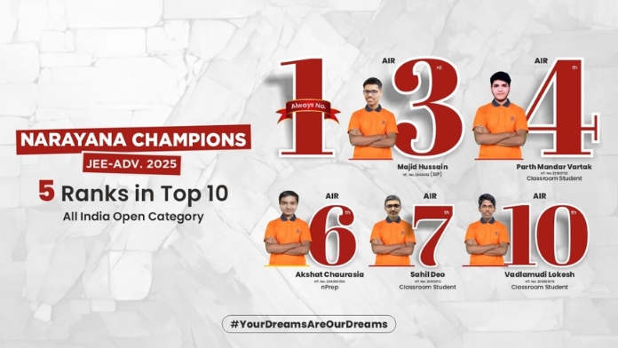 New Delhi [India], June 4: The results of JEE Advanced 2025 reflect Narayana Educational Institutions’ continued dominance, with 5 students achieving top 10 All India Open Category ranks. Majid Hussain (AIR 3), Parth Mandar Vartak (AIR 4), Akshat Chaurasia (AIR 6), Sahil Deo (AIR 7), and Vadlamudi Lokesh (AIR 10) represent Madhya Pradesh, Maharashtra, Rajasthan, Maharashtra, and Andhra Pradesh respectively, exemplifying the institution’s strong academic culture.