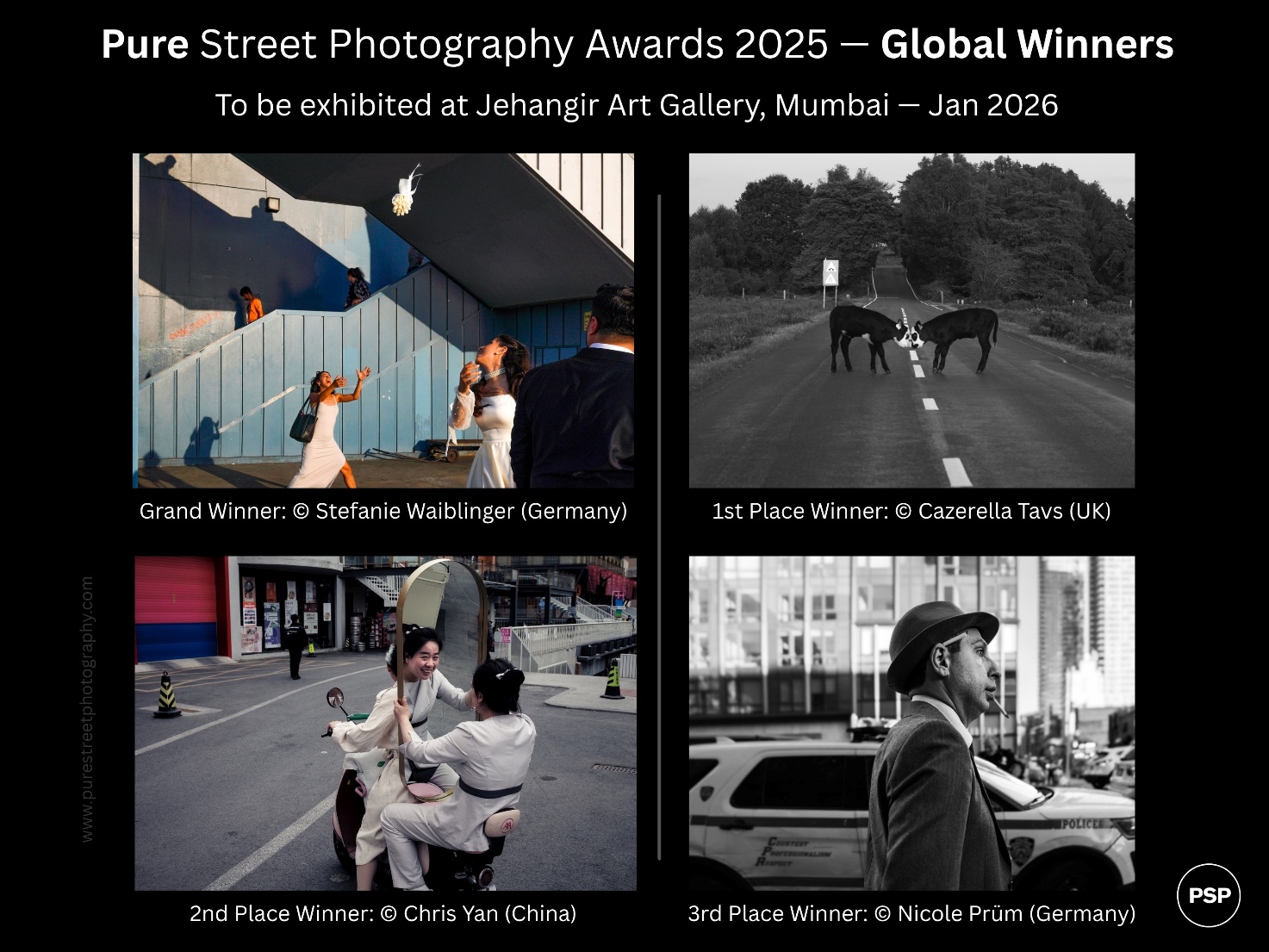 A total of 147 winning and finalist photographs will be exhibited at the Pure Street Photography Awards Exhibition at the iconic Jehangir Art Gallery in Mumbai from 22nd to 27th January 2026. The Jehangir is one of India’s most prestigious and most visited cultural landmarks.